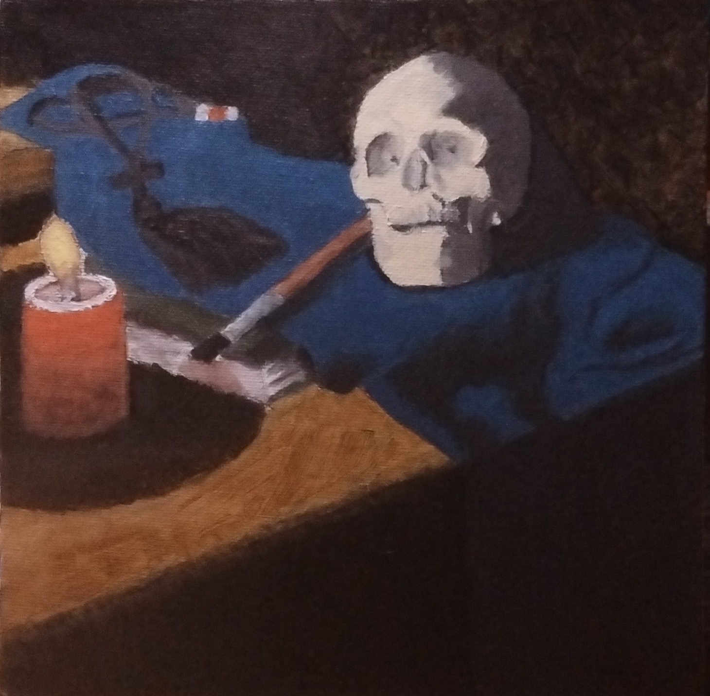 4. Memento Mori – My most recent painting. Another still Life, It is an homage to remembering that I must die. The composition was set on the corner of my desk. It consist of my artist skull named Gary. The cloth was actually a handkerchief from my army days draped over my art journal. The olive green color didn’t work so I made it blue. I used one of my paint brushes to represent my passion to share beauty and truth through painting. My prayer rope (They look a lot like a rosary) to represent eternal life in Jesus Christ. The red candle, actually candle the candle light, represents the sensual aesthetic of doing things with your own hands. I actually had a purchase offer on it from a friend.